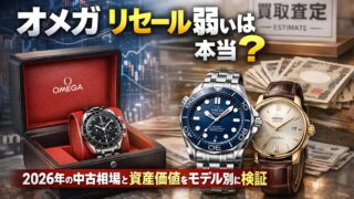 オメガは本当に資産価値がないのでしょうか。この記事では、2026年の中古相場をもとに、スピードマスターやシーマスターの評価、リセールが弱いと言われる理由、後悔しにくい選び方を分かりやすく解説します。オメガを買うか迷っている人や、売却時の価値まで考えて選びたい人におすすめです。
