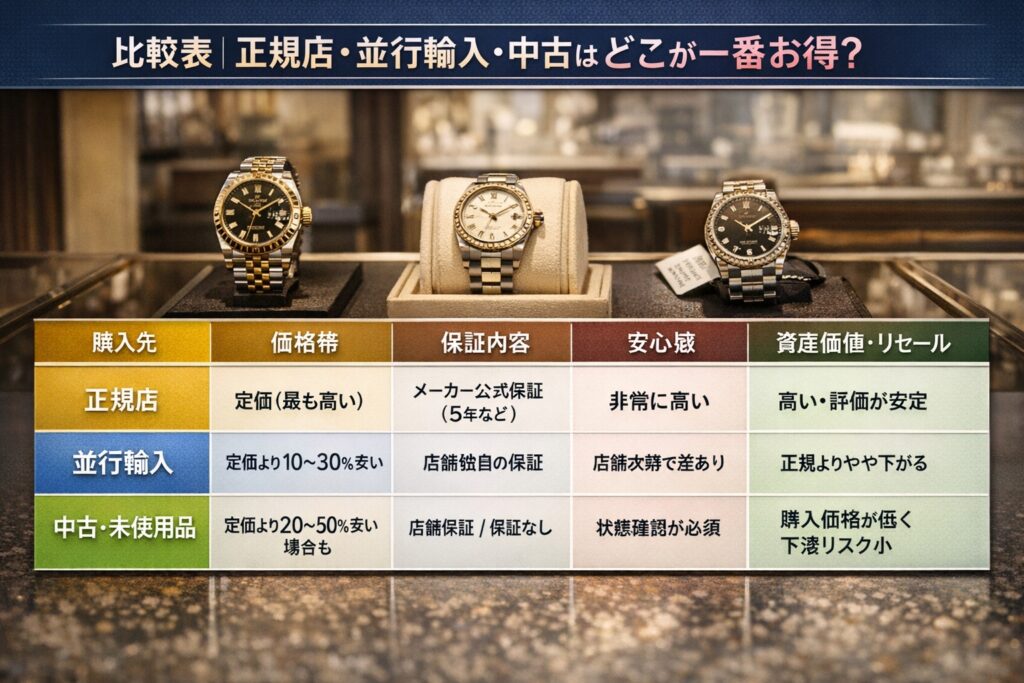 購入先には正規店・並行輸入・中古(未使用品含む)がありますが、どれが正解かは人によって異なります。安心を最優先する人、価格を抑えたい人、将来売ることまで考えたい人では、最適な選択肢が変わるためです。