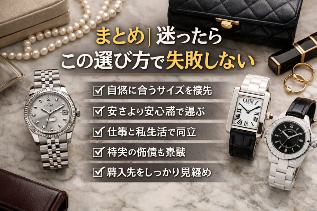 30代女性が高級時計で後悔しないためには、デザインやブランドのイメージだけで決めないことが大切です。サイズ感、価格の理由、保証やメンテナンスといった要素を冷静に整理することで、失敗の多くは防げます。