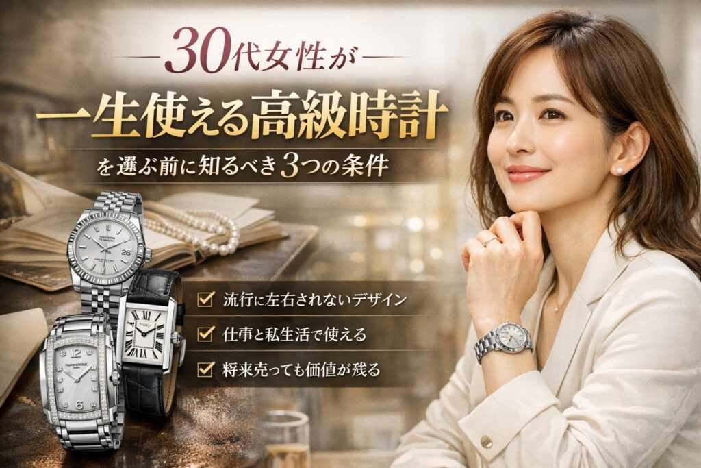 30代女性が高級時計を選ぶ際は、「今の好み」だけでなく、これから先の人生まで見据えることが重要です。本記事では、一生使える条件、後悔しにくいブランド、購入先の考え方まで整理しました。最後に迷ったときの判断軸を振り返ります。